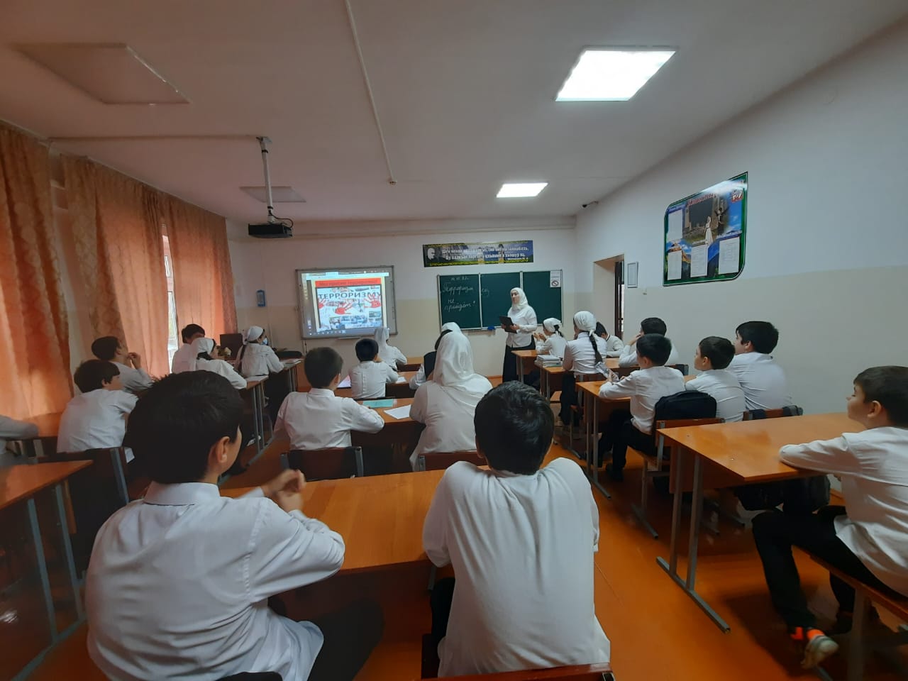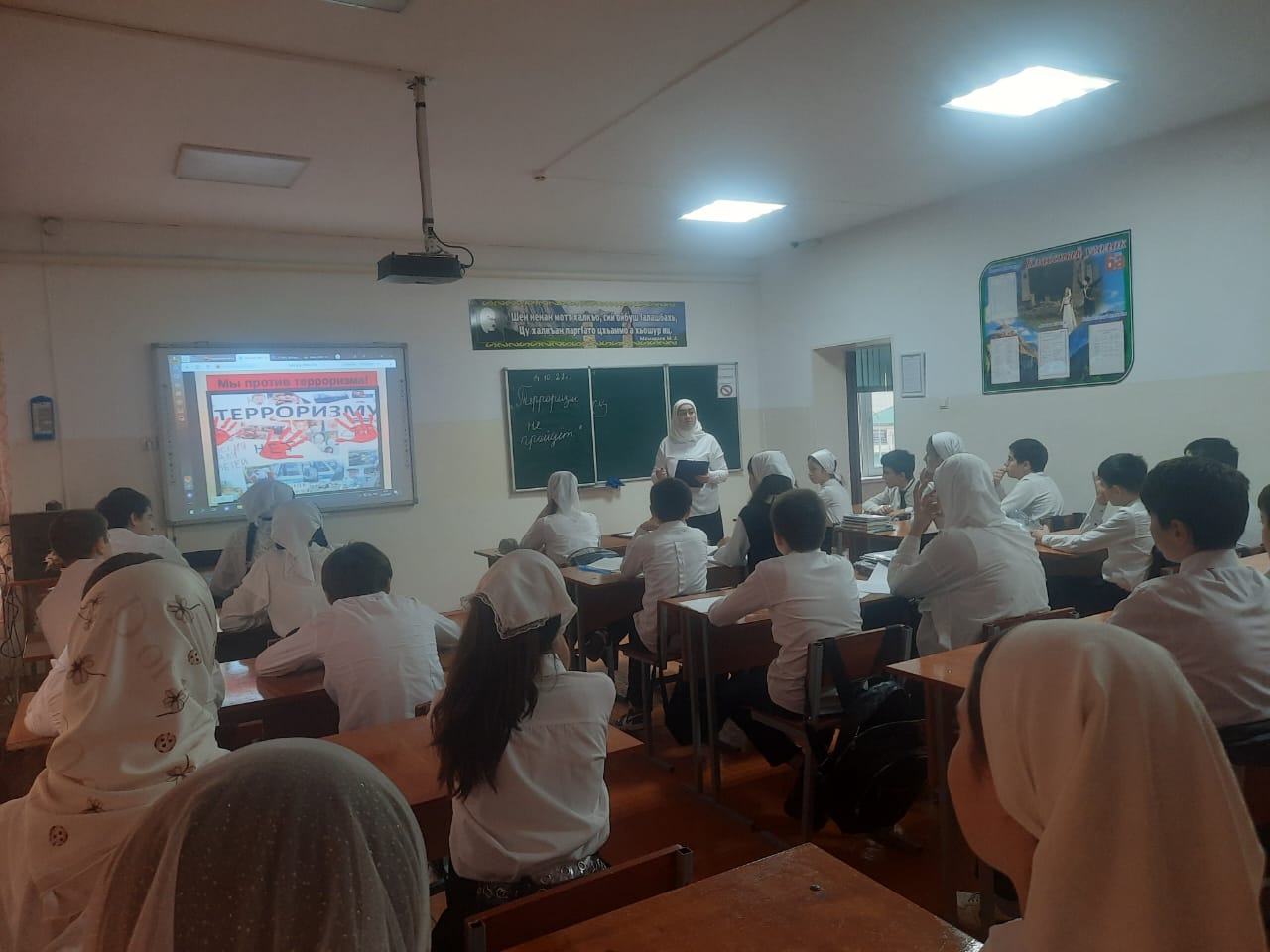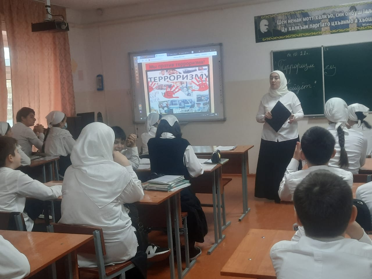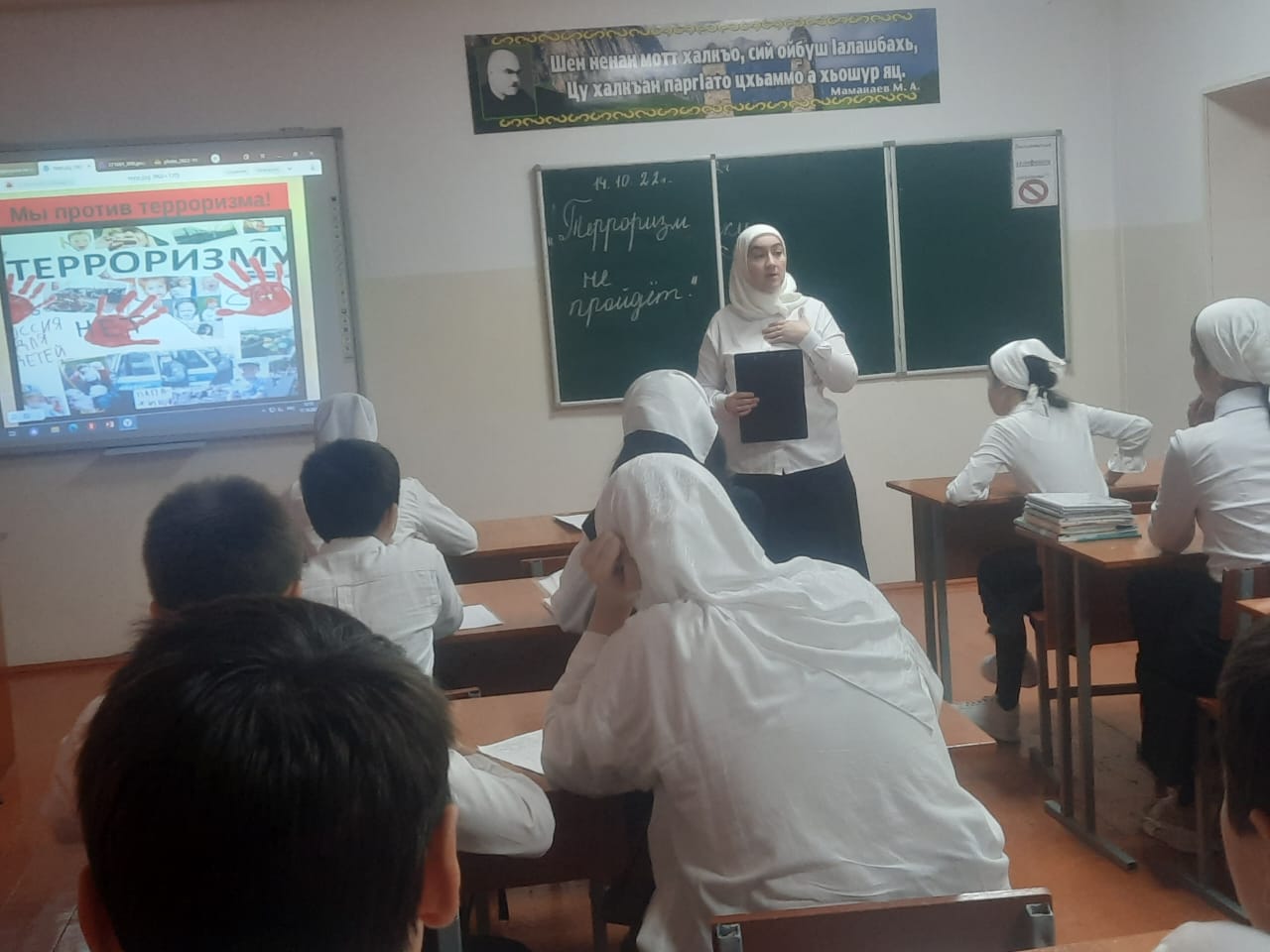 14.10.2022г. В МБОУ "Гудермесская СШ 3" Прошел урок на тему "Терроризм не пройдёт" в 7 и 8 классах посвященное борьбе с идеологии терроризма, павших героев отдавших своей жизни, спасая детей