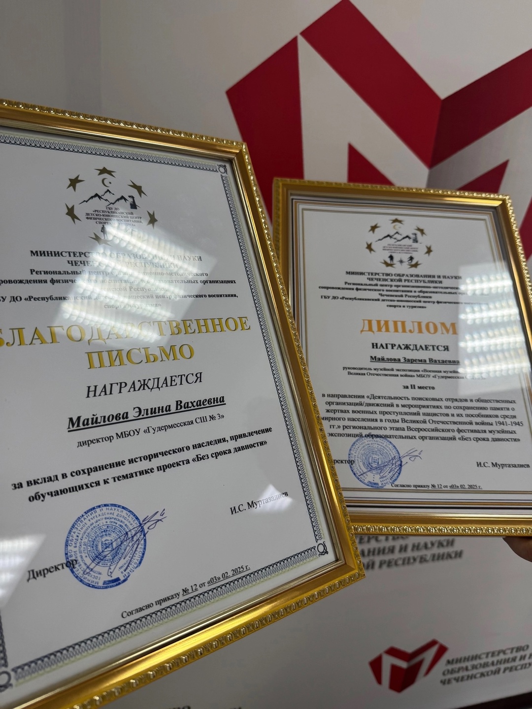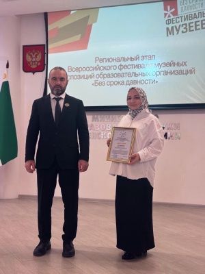 05.05.2025Наша школа приняла участие во Всероссийском фестивале музейных экспозиций образовательных организаций «Без срока давности», который направлен на сохранение исторической памяти о жертвах военных преступлений во времена Великой Отечественной войны 1941–1945 годов. По итогам регионального этапа фестиваля мы заняли почётное 2 место!На днях Майловой З.В. торжественно вручили диплом за 2 место от Министерства образования Чеченской Республики.А также благодарственное письмо было вручено директору школы Майловой Э.В. за поддержку и вклад в реализацию проекта. Поздравляем с заслуженной наградой и благодарим за важную работу по сохранению исторической памяти!#БезСрокаДавности #ИсторияЖива #ПамятьВДеталях #НашаГордость #МинобрЧР #МыПомним