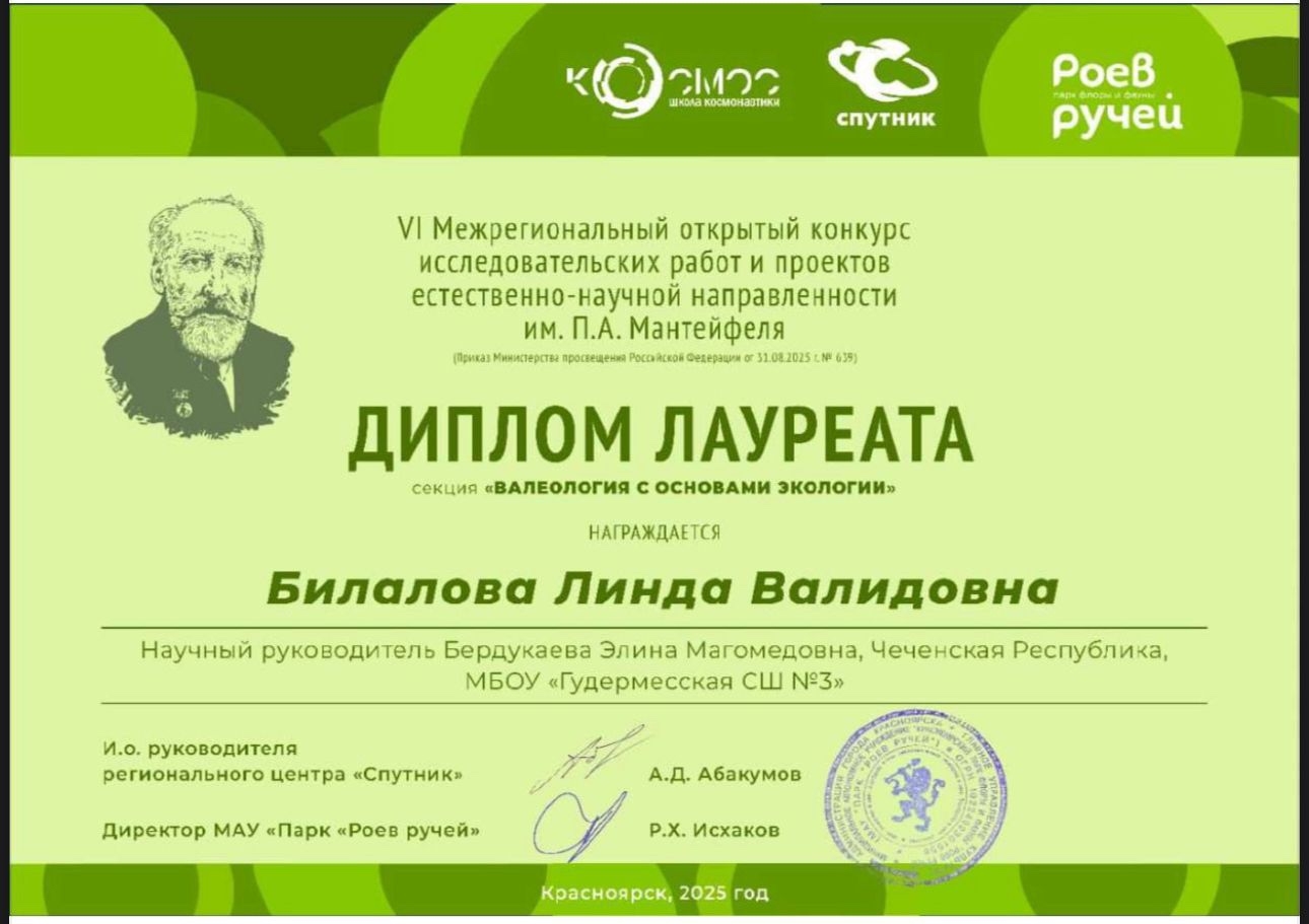 22.12.2025Рубрика «Наши талантливые дети» продолжается!Мы хотим сообщить о замечательных успехах наших юных исследователей на VI межрегиональном открытом конкурсе исследовательских работ и проектов естественно-научной направленности им. П.А. Мантейфеля.Особенно гордимся достижением нашей обучающейся 10-го естественно-научного класса, Билаловой Линды — она стала лауреатом этого престижного конкурса. Ее проектная работа показала отличные результаты, продемонстрировала её талант, усердие и творческий подход. Это заслуженная победа, которая вдохновляет нас и подтверждает высокий уровень наших учеников и наставников.Мы очень рады за наших талантливых детей и их наставников, которые своим трудом и увлеченностью делают нашу школу гордой. Такие достижения вдохновляют нас на новые победы и успехи.Желаем Линде и всем нашим ребятам дальнейших успехов, новых свершений и ярких побед! Пусть ваши мечты и упорство приводят вас к большим достижениям и раскрывают все ваши таланты!Вперёд к новым вершинам и ярким будущим!